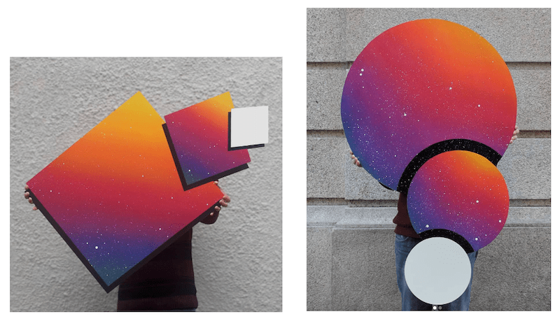 I like to paint with materials that allow me more easily to make gradients. For example, my doing gradients comes a lot from having started experimenting with spray because the spray itself allows the handling of the can in a certain way to create that diffuse effect. Of course, I can also do that with acrylic, with oil, with aquarelle for example. But I have stayed more with the spray, I also use the airbrush with water-based paints because it is a tool that also allows me to do the same effects as the spray. The smaller size, which is the only drawback that sprays paint has, is that below a certain size it can run, it can smudge. So I invested in an airbrush to be able to do new experimentations and I really like it. And that’s it. In terms of materials, I’m not a very weird person, I can paint with anything. I also like to paint morals with plastic paint. I also like to have some environmental awareness when it comes to using sprays. So I try to avoid it a little bit. Although it’s something I really like to use, I try to use it sparingly.
