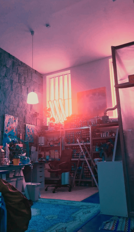 O meu ateliê situa se junto ao Marquês e aos Combatentes. Fica no complexo Lusolima. Foi um complexo desenhado por arquitetos e, entretanto, tornou se um marco da arquitetura aqui na zona. E uma característica que estes prédios têm é que rés-do-chão, as caves, por assim dizer, foram idealizadas para serem ateliês para artistas. E alguns deles foram feitos para artistas que os arquitetos conheciam. Por exemplo, se era um escultor, era feito de uma maneira. Se era um arquiteto, era de outra forma. Se era um pintor, tinha outras características. O ateliê onde eu estou foi do escultor Gustavo Bastos, penso que é assim o nome dele, se não estou em erro. Nós fizemos algumas adaptações – divido o atelier com o meu namorado também é artista, o Filipe Granja, cujo nome artístico é mynameisnotSEM https://www.instagram.com/mynameisnotsem/ – por exemplo, criamos um laboratório, por assim dizer, que é uma espécie de uma sala onde nós pintamos a spray, que é para não sujar um estúdio todo e não ter ali, por exemplo, os gases mais tóxicos concentrados.