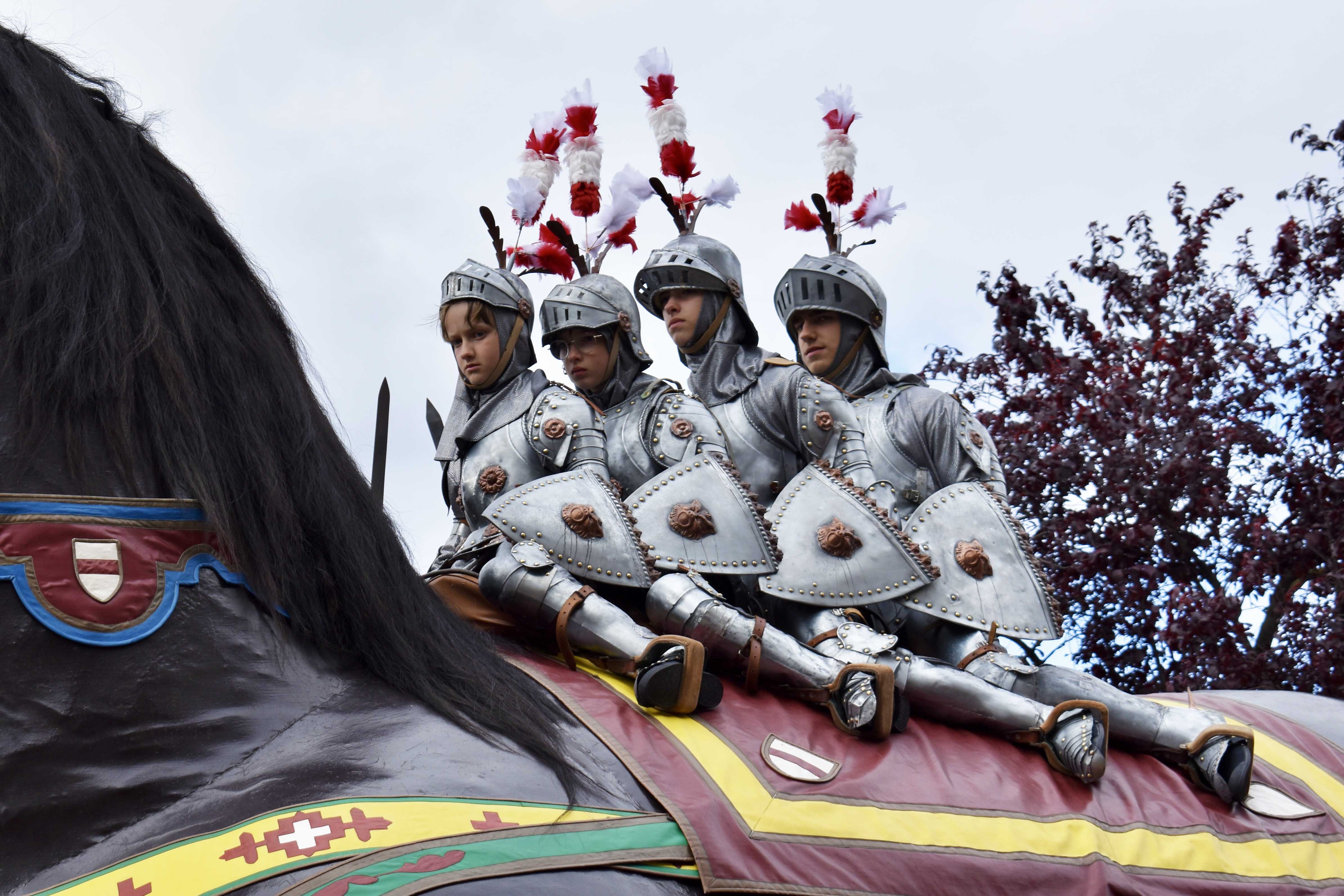 The Ros Beiaard Parade commemorates the legend of Renaud de Montauban and his horse, Bayard (Beiaard in Flemish). The legend dates back to the medieval chanson de geste cycles, the first known account being given by the 12th-century poem Quatre Fils Aymon. As usual with this literary genre, there are many versions of the legend, which nonetheless share some fixed points. First, Bayard was a special horse, provided with intelligence, able to become bigger and even to talk. Second, Renaud had to flee from Charlemagne with his three brothers and they rode Bayard to safety (here’s the reason of the four heemskinderen of Dendermonde). Third, appeased with Charlemagne, Renaud’s punishment was to attend the killing of Bayard: with stones chained to its body, the horse was thrown into a river (which the Dendermondenaars identify with the Scheldt) and sentenced to be drowned while Renaud was watching. According the Quatre Fils Aymon, the horse survived and lives since in the woods. The story of Renaud and Bayard is a fascinating, paradigmatic case of pure medieval fiction steeped in chivalric code with hints of drama that get into anyone’s imagination.