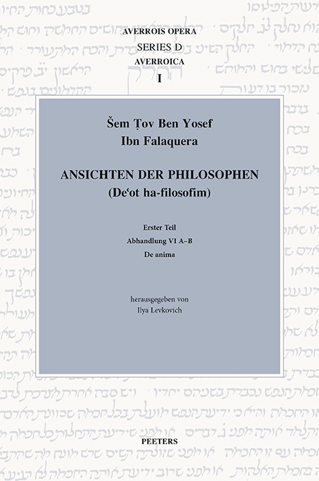 Ilya Levkovich (ed.), Šem Tov Ben Yosef Ibn Falaquera, ‘Ansichten der Philosophen’ (De’ot ha-filosofim). Erster Teil, Abhandlung VI A-B: De anima. Peeters 2024