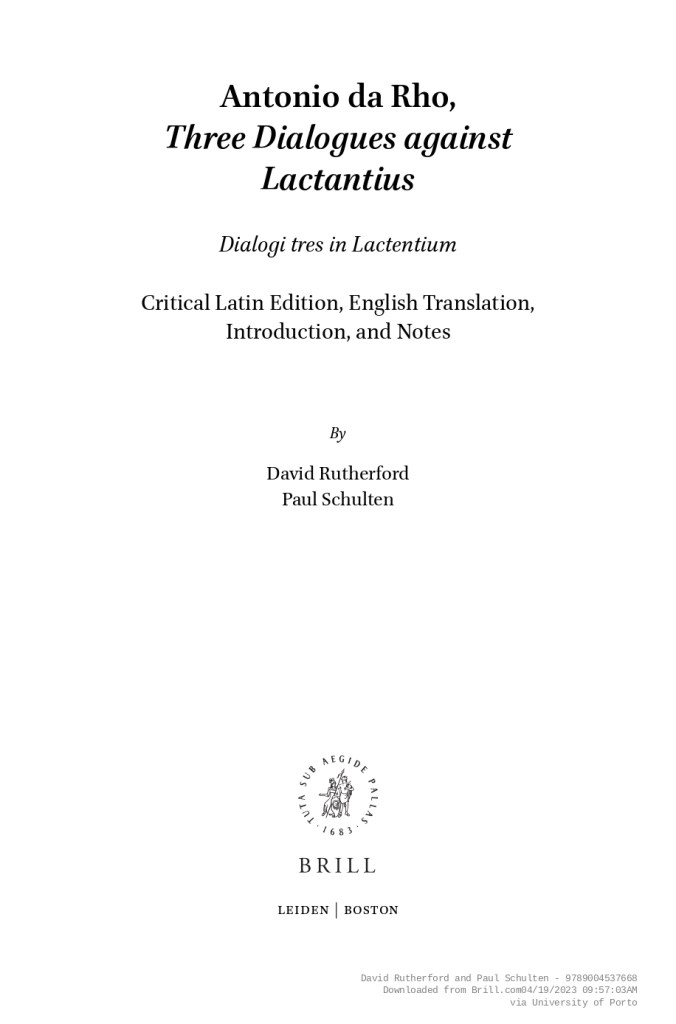 David Rutherford and Paul Schulten (eds. and transl.), Antonio da Rho, Three Dialogues against Lactantius (Brill 2023)