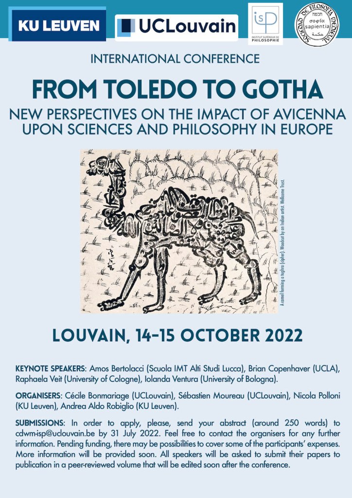 A joint collaboration among KU Leuven, UCLouvain, and SOFIME, the conference will foster a general re-setting of the debate on the “Avicenna Latinus”, shedding light on some obscure aspects of his influence on European philosophy through an organic, longue-durée and inter-linguistic approach to his philosophical production. Avicenna’s role in the constitution of European philosophy and science will be examined by discussing a series of intertwined questions touching upon a plurality of domains and aspects, from the material production and circulation of the Latin translations of Avicenna’s works to the impact of the latter on philosophical doctrines and medical practices developed in Europe.
