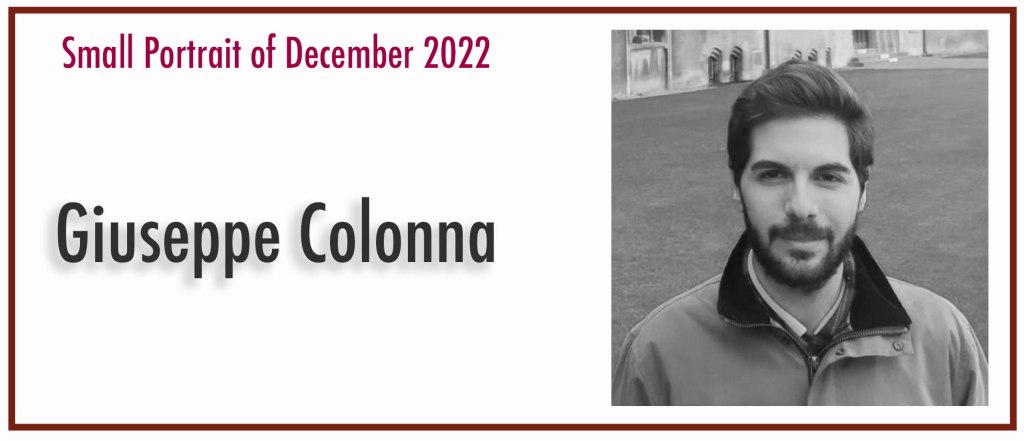 December 2022 – For our small portrait #7 – and before 2022 ends – meet Giuseppe Colonna! Giuseppe is a PhD Candidate at the University of Oxford. He works on a thesis about Being in Time in Simplicius, under the direction of Cecilia Trifogli (All Souls College, Oxford). Simplicius, one of the greatest Neoplatonic commentators of Aristotle, tries to solve some problems within the Aristotelian account of being in time. Aristotle gives some criteria to distinguish things in time (concrete things) and things not in time (heavens and souls). However, he does not precise the essential feature that distinguishes the former from the latter, in other words, what the real significance of being in time is. Giuseppe’s research aims to explore Simplicius’ solutions to this problem and to assess how this contributes to the understanding of the nature of time within metaphysics.