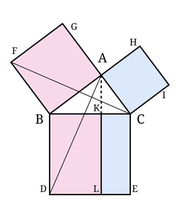 Let’s consider an example with which most people will be familiar: the Pythagorean Theorem. For every right-angled triangle, the area of the squares built on the two shorter sides is equal to the area of the square built on the hypotenuse. Euclid’s original proof is complicated, involving a series of steps to show that the area of square BAGF is equal to the area of square BDLK, and that the area of square ACIH is equal to the area of square CELK. This involves proving other properties about different shapes and constructions within the diagram on the right. The proof of Euclid can be simplified in some ways. But not by much. This is if we follow the same methods: showing that two segments are of equal length just by the parallel postulate and building rectangles are built inside them to show that two areas are equal. The proof is difficult to grasp, and it takes time to master the method in a way that allows it to be used in other contexts.