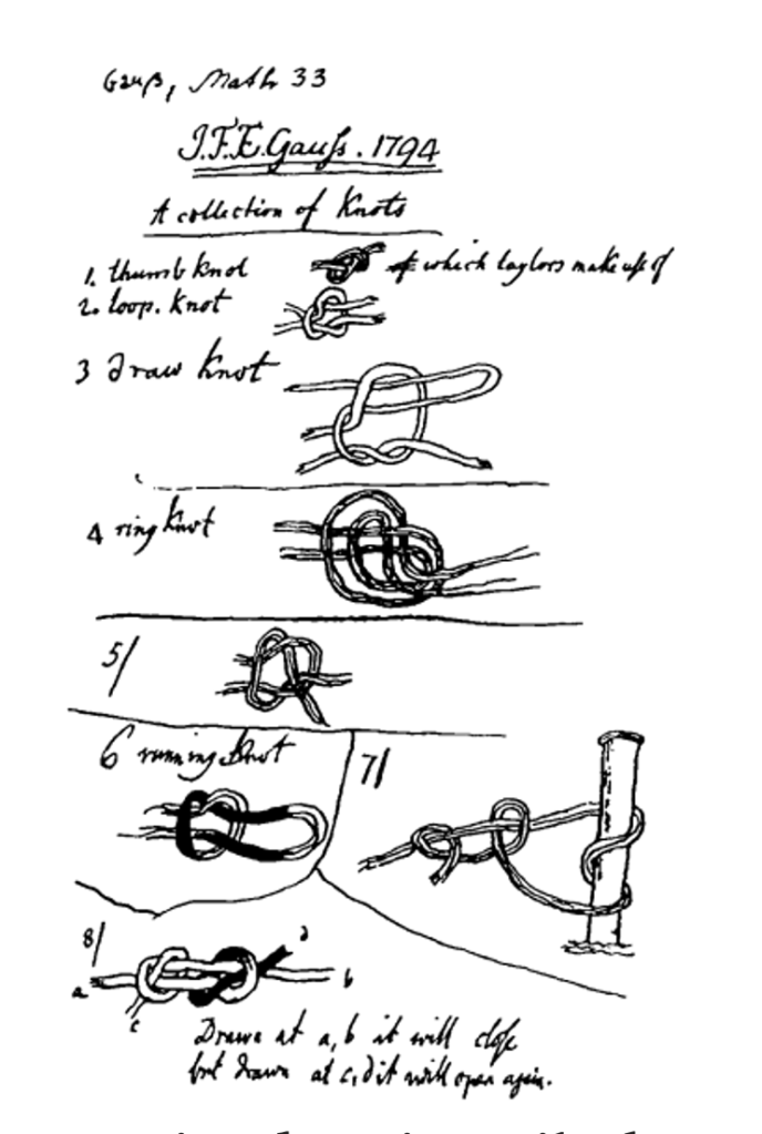 Take for instance the image here on the side, taken from C.F. Gauss’ notebook when he was seventeen (taken from Turner & Griend 1995). It seems that he was attempting to create a catalogue of knots based on an invariant property that he had identified. Nowadays, knots are studied in topology, but in Gauss’s time, they were not considered particularly mathematically interesting, which is a crucial detail. Just as Euclid could only deal with concrete segments, Gauss could only start from concrete knots made of rope and try to derive something from observing them. One might expect a genius to be able to produce something from observation alone, but as far as we know, he did not succeed and did not publish anything about it. This is despite the fact that Gauss was certainly more intelligent than most current master’s students in mathematics, who could easily prove what Gauss thought he saw (and more) using simple algebraic manipulation analogous to that used in arithmetic. What he lacked was not intelligence or perspicacity, but rather conceptual means.